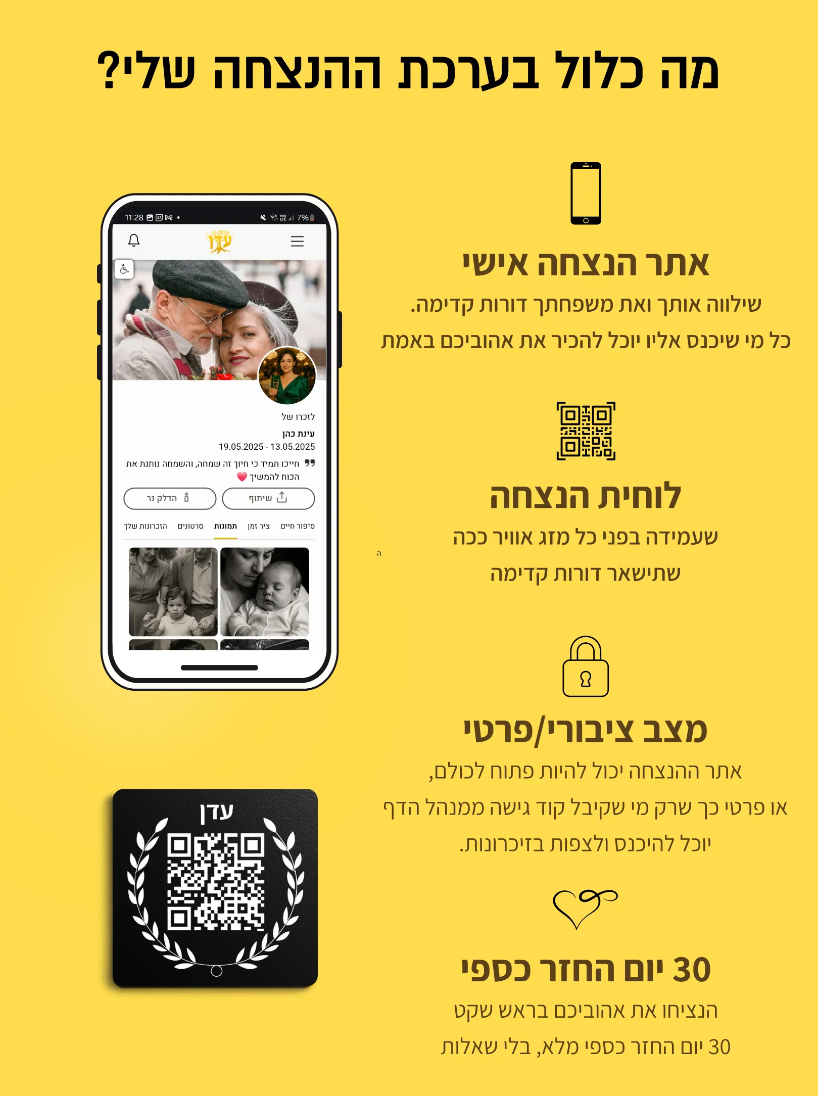 כל זה על מנת שעמוד ההנצחה של יקיריך ישמר בשבילך, בשביל המשפחה שלך, ובשביל הדורות הבאים.