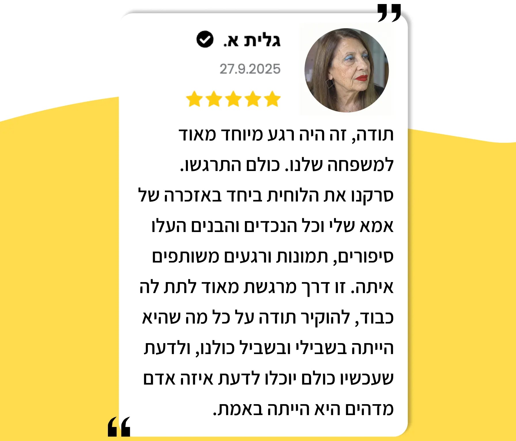 אנחנו כל כך בטוחים שנעזור לך להנציח את אהובך בדרך הכי מרגשת ומכבדת שיכולה להיות, שאנחנו מציעים החזר כספי מלא ל-30 יום ללא שאלות!
